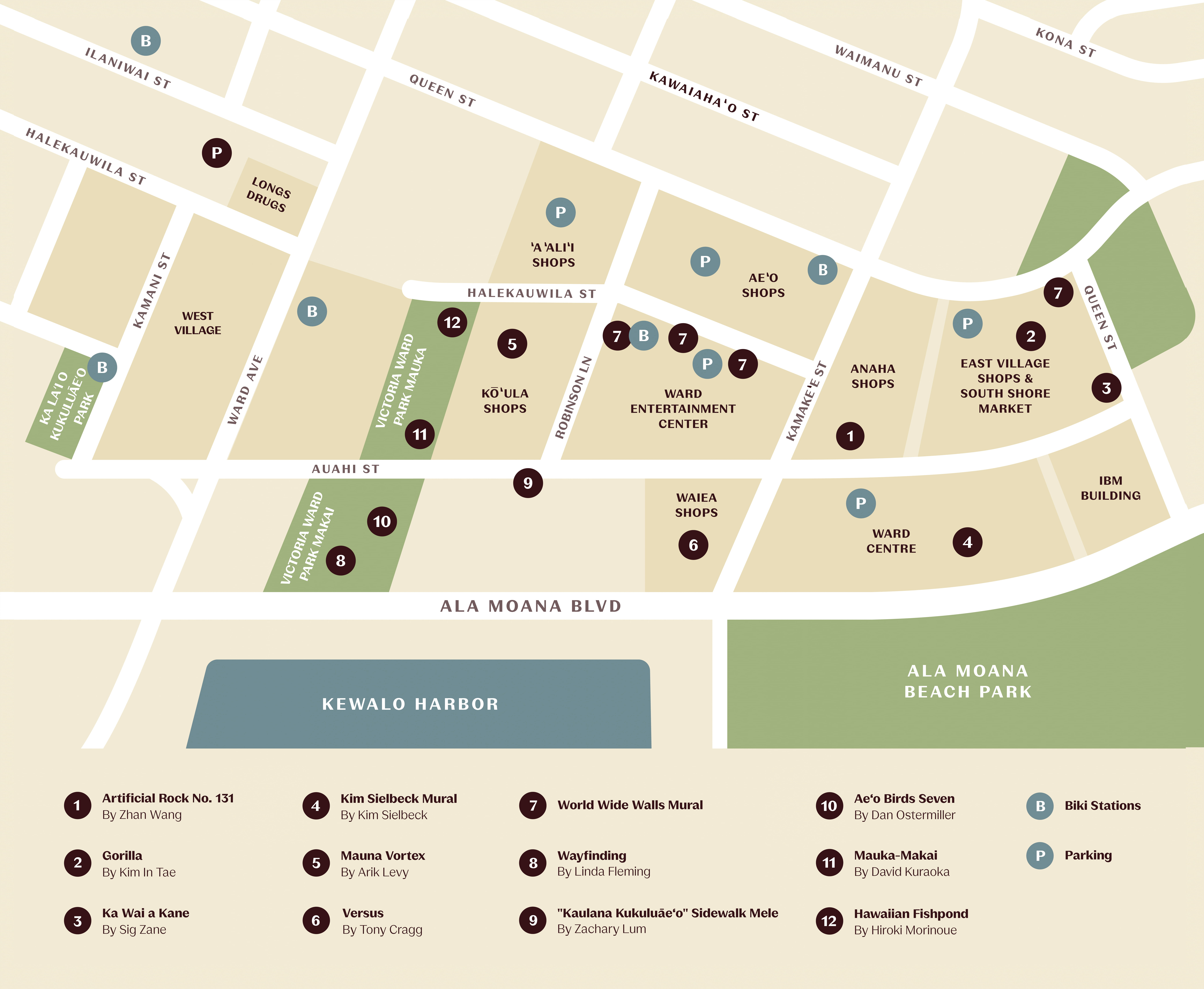 From large murals to dazzling sculptures, Ward Village is home to an array of works of art enhancing the streetscapes crafted by acclaimed artists such as Sig Zane and Kim Sielbeck. Each residence, from Waiea to Kōʻula, also features a curated collection inspired by its architectural design and stunning island backdrop from the likes of Sir Tony Cragg, Sophie-Elizabeth Thompson, and more.