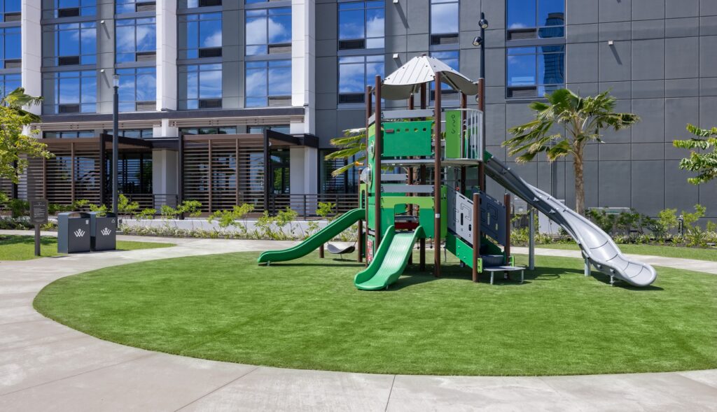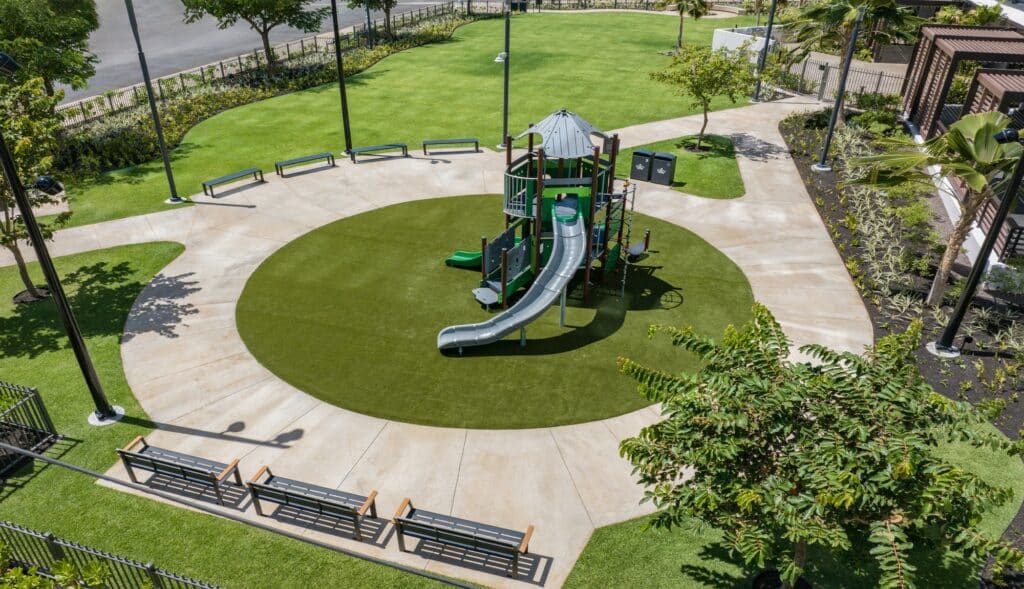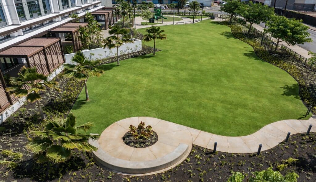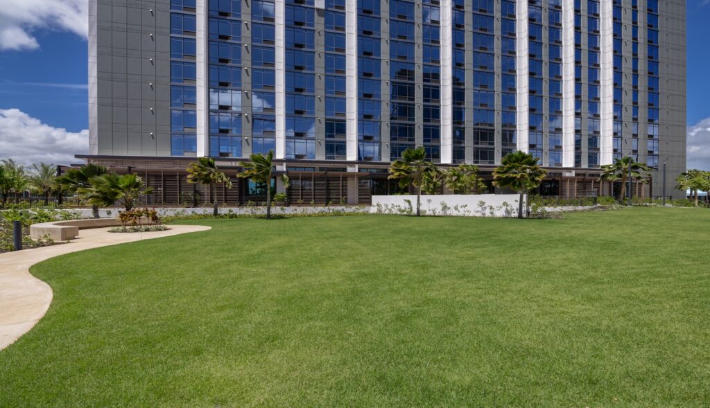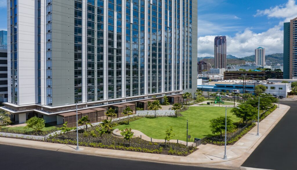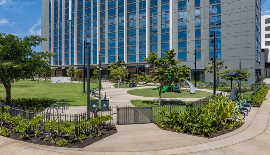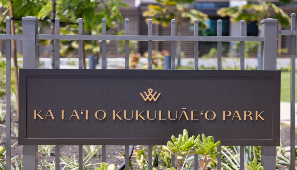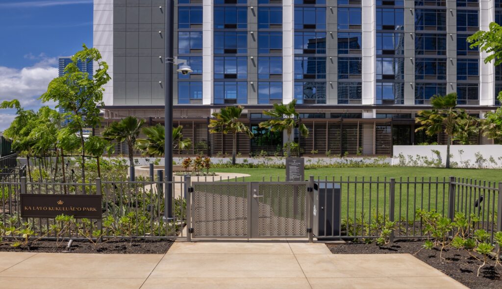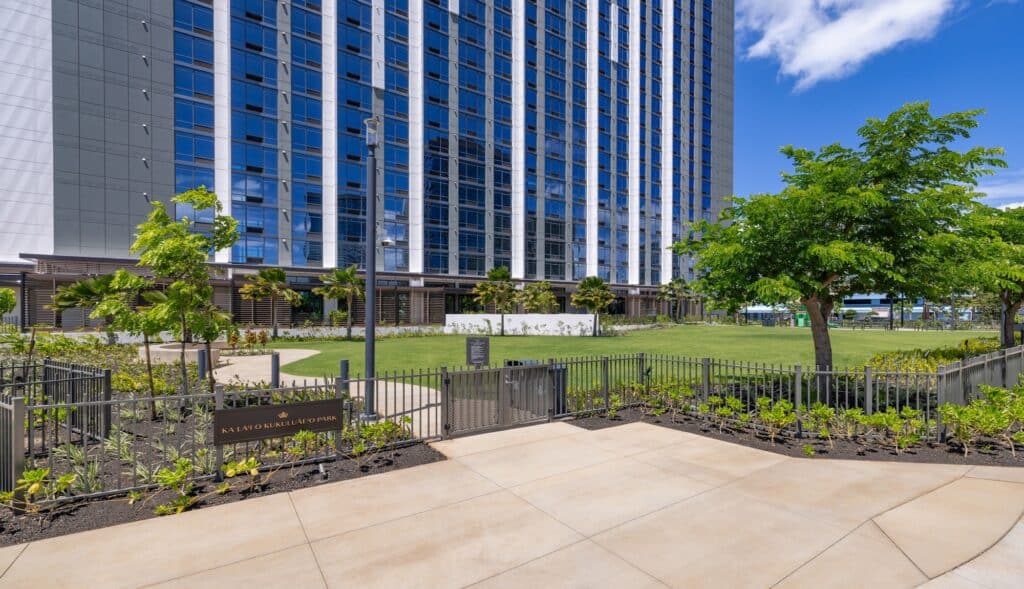 The Ala Moana Boulevard Pedestrian overpass (“overpass”) is a State of Hawaiʻi Department of Transportation (“State DOT”) safety project completed in 2025. This mauka-makai oriented land bridge links the paths on either side of Ala Moana Boulevard to provide pedestrians and bicyclists a safer way to cross Ala Moana Boulevard. Victoria Ward, Limited donated the land for the project and financially contributed to the bridge design and environmental documentation. The State DOT was responsible for the construction and completion of the overpass. The Ward Village Owners Association, the Ward Village master community association, is responsible for the management, maintenance and upkeep of the overpass and any costs associated therewith. All photos and rendered images may not be to shown scale and are being provided for illustrative purposes only.
