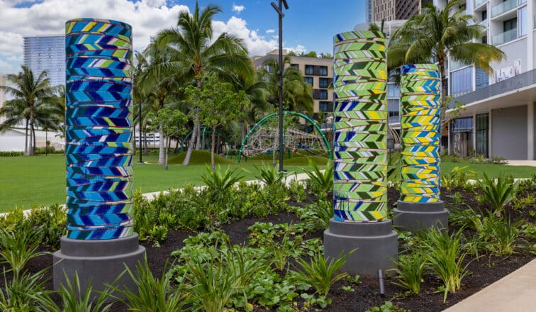 Stroll the sidewalk fronting Victoria Place along Auahi Street in Ward Village to view the Hawaiian and English lyrics of “Kaulana Kukuluāeʻo,” the new mele that honors the legacy of wayfinding and the land’s historical significance.