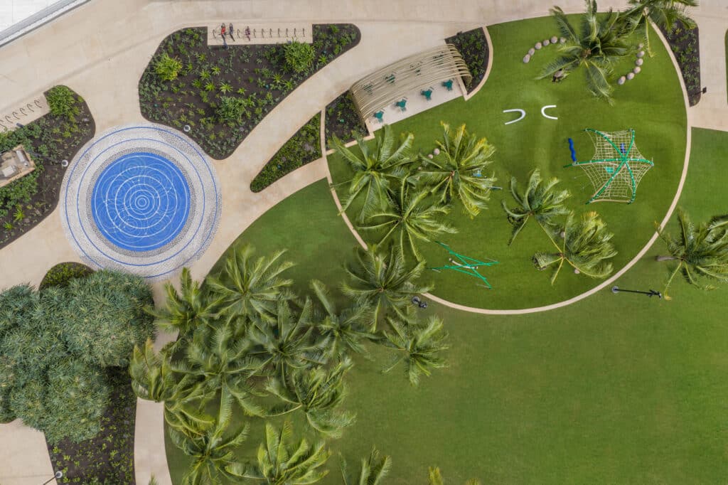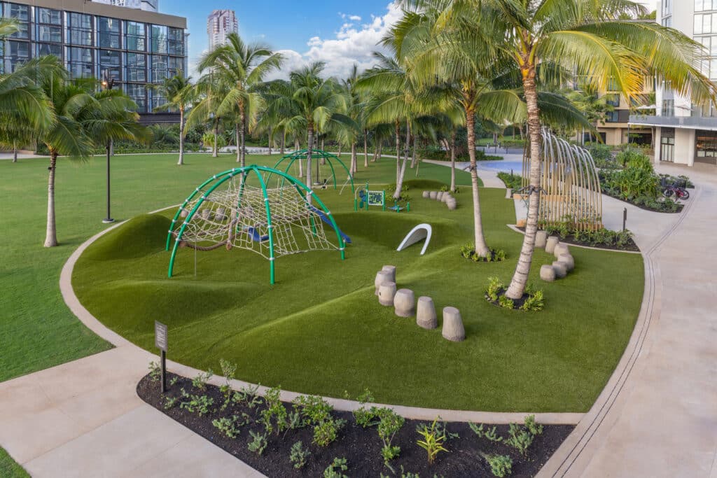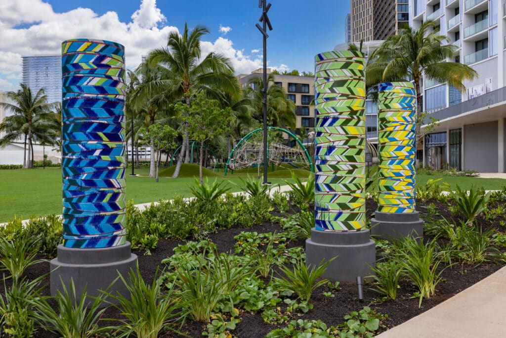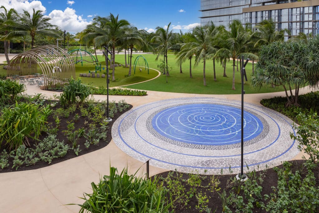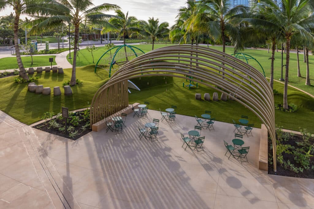Framed by surrounding storefronts and restaurants, the mauka green space features mindfully designed seating areas, expansive playground, and introduces public art by Hawaiʻi-based artists Hiroki Morinoue and David Kuraoka.