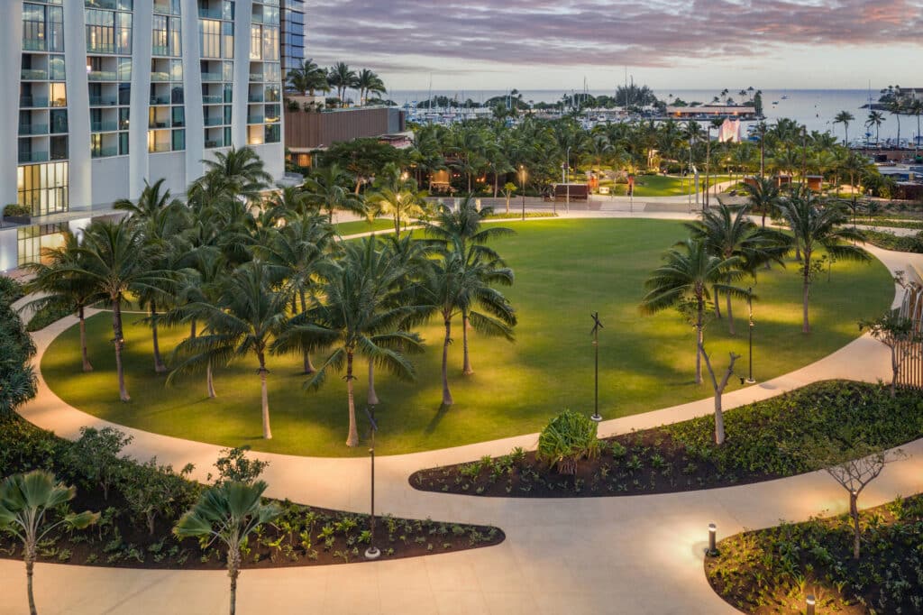 Earning a SITES certification, the makai side of this vibrant gathering space features native plants, a pond honoring the underground freshwater flow of the area’s historic ʻauwai, educational signage, as well as retail kiosks and art installations by Linda Fleming and Dan Ostermiller.