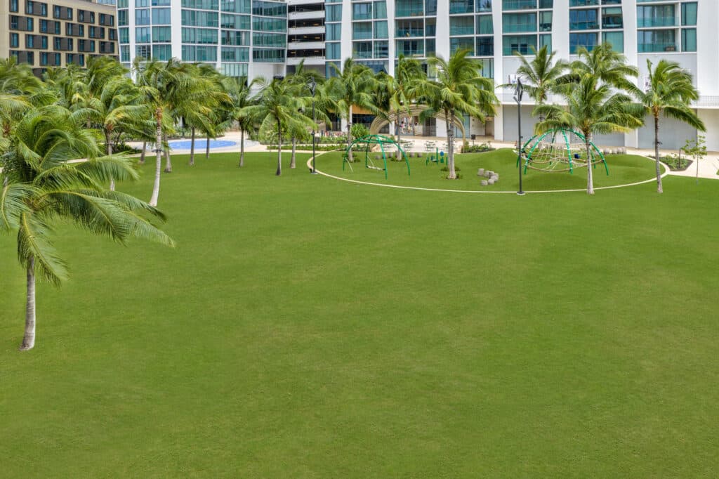 Welcome to Victoria Ward Park! This 3.5-acre public park acts as a central open space at the heart of the community. Together with the Ala Moana Elevated Walkway, the park’s design enhances connectivity, wellness, everyday gathering, and placemaking–the cornerstones of Ward Village’s ongoing vision for the neighborhood.